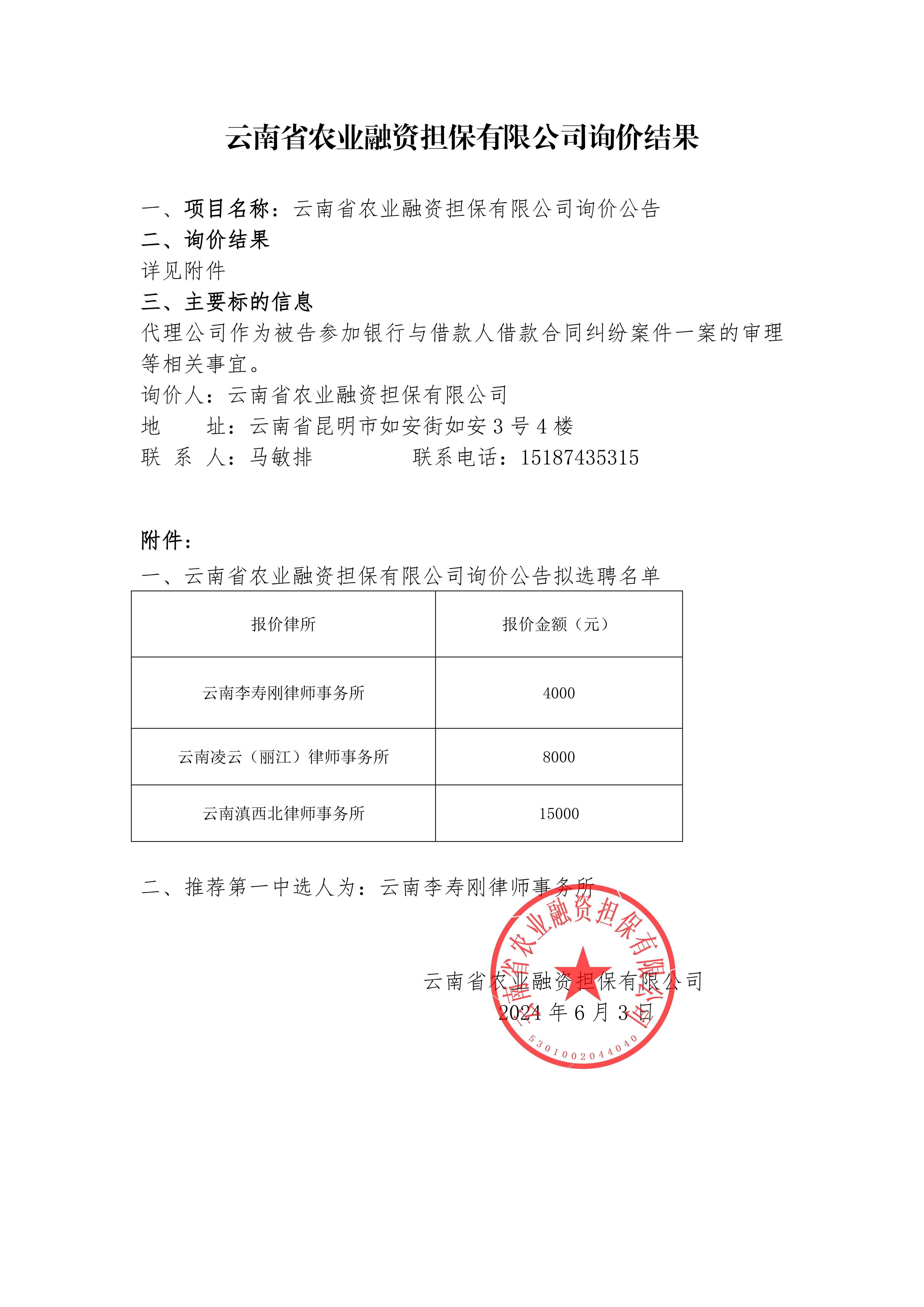 云南省農業(yè)融資擔保有限公司詢價結果