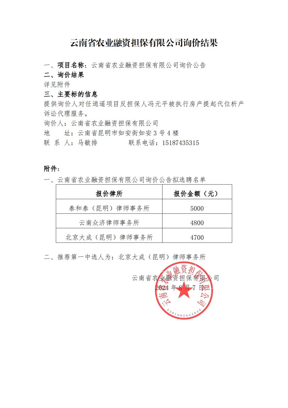 云南省農(nóng)業(yè)融資擔保有限公司詢價結(jié)果