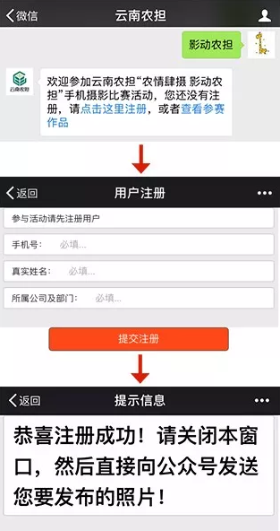 參與方式二:關(guān)注“云南農(nóng)擔(dān)”官方微信號(hào),點(diǎn)擊“農(nóng)擔(dān)+”欄目,選擇“影動(dòng)農(nóng)擔(dān)”進(jìn)入,查看教程后,完成信息錄入,在對話框內(nèi)發(fā)送1張圖片及一句話描述即可。