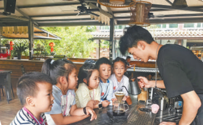 小凹子咖啡莊園內(nèi),咖啡師為前來研學體驗的小朋友們制作手沖咖啡。廖洪文 攝