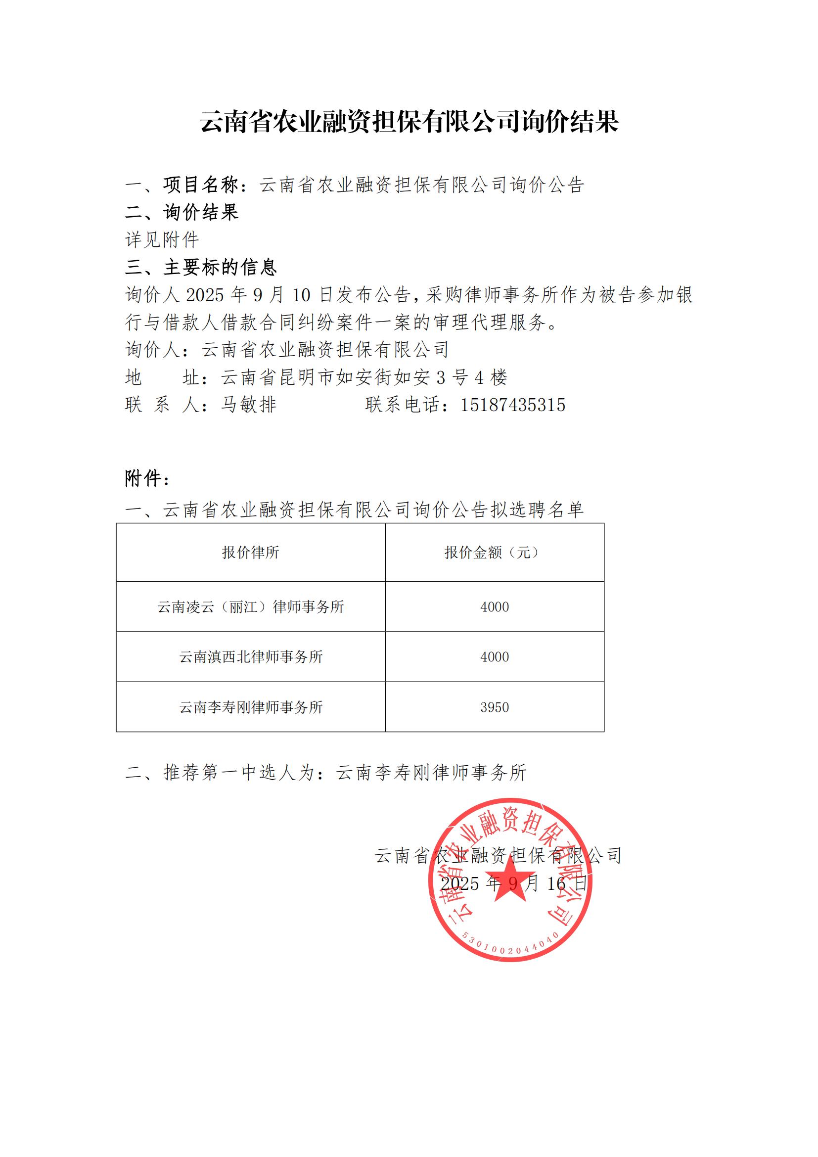 云南省農(nóng)業(yè)融資擔(dān)保有限公司詢價結(jié)果