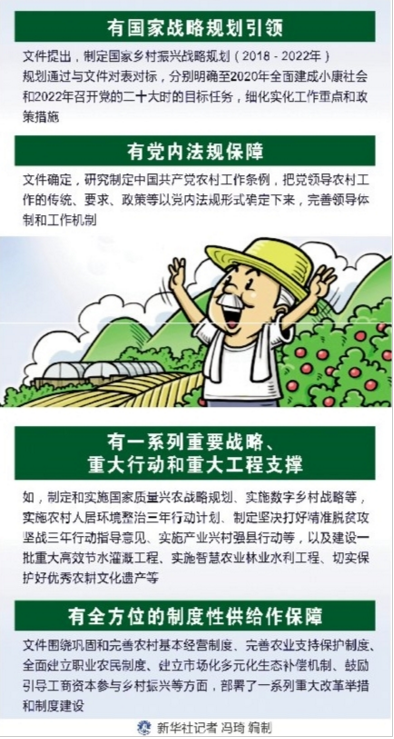 ——有一系列重要戰(zhàn)略、重大行動(dòng)和重大工程支撐。如,制定和實(shí)施國家質(zhì)量興農(nóng)戰(zhàn)略規(guī)劃、實(shí)施數(shù)字鄉(xiāng)村戰(zhàn)略等,實(shí)施農(nóng)村人居環(huán)境整治三年行動(dòng)計(jì)劃、制定堅(jiān)決打好精準(zhǔn)脫貧攻堅(jiān)戰(zhàn)三年行動(dòng)指導(dǎo)意見、實(shí)施產(chǎn)業(yè)興村強(qiáng)縣行動(dòng)等,以及建設(shè)一批重大高效節(jié)水灌溉工程、實(shí)施智慧農(nóng)業(yè)林業(yè)水利工程、切實(shí)保護(hù)好優(yōu)秀農(nóng)耕文化遺產(chǎn)等。
