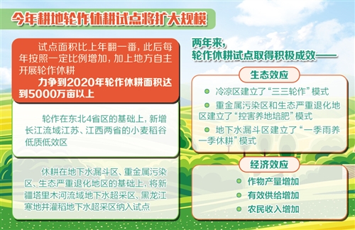 在2月23日的農(nóng)業(yè)部新聞發(fā)布會上,農(nóng)業(yè)部種植業(yè)司司長曾衍德表示,今年我國耕地輪作休耕試點將擴大規(guī)模,試點面積比上年翻一番,此后每年按照一定比例增加,加上地方自主開展輪作休耕,力爭到2020年輪作休耕面積達到5000萬畝以上。同時,還將實現(xiàn)區(qū)域拓展。輪作在東北四省區(qū)的基礎(chǔ)上,新增長江流域江蘇、江西兩省的小麥稻谷低質(zhì)低效區(qū);休耕在地下水漏斗區(qū)、重金屬污染區(qū)、生態(tài)嚴重退化地區(qū)的基礎(chǔ)上,將新疆塔里木河流域地下水超采區(qū)、黑龍江寒地井灌稻地下水超采區(qū)納入試點范圍。
