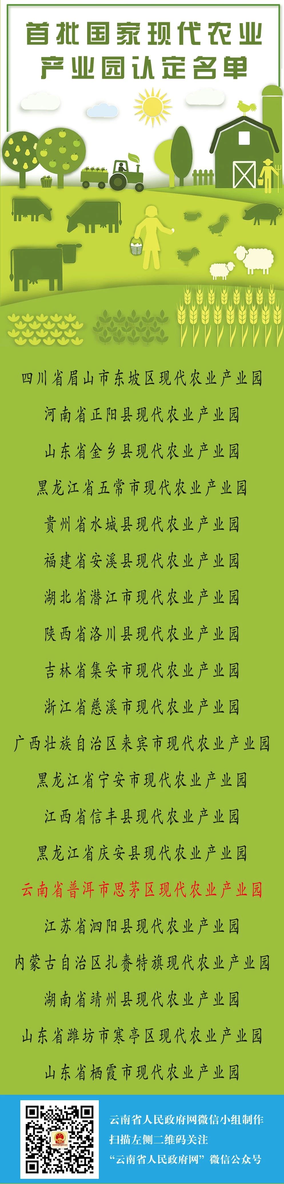 在2018年12月30日召開的全國農(nóng)業(yè)農(nóng)村廳局長會(huì)議上,農(nóng)業(yè)農(nóng)村部、財(cái)政部公布:經(jīng)自評(píng)申請(qǐng)、省級(jí)推薦、績效評(píng)價(jià)和現(xiàn)場(chǎng)考察等程序,四川省眉山市東坡區(qū)等20個(gè)現(xiàn)代農(nóng)業(yè)產(chǎn)業(yè)園被認(rèn)定為首批國家現(xiàn)代農(nóng)業(yè)產(chǎn)業(yè)園,其中云南省普洱市思茅區(qū)現(xiàn)代農(nóng)業(yè)產(chǎn)業(yè)園入選。