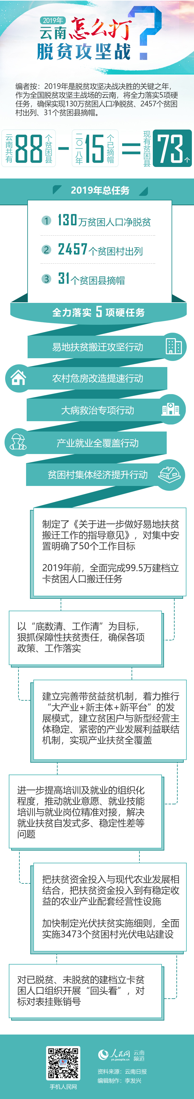 2019年是脫貧攻堅決戰(zhàn)決勝的關(guān)鍵之年,作為全國脫貧攻堅主戰(zhàn)場的云南,將全力落實(shí)易地扶貧搬遷攻堅行動、農(nóng)村危房改造提速行動、大病救治專項行動、產(chǎn)業(yè)就業(yè)全覆蓋行動、貧困村集體經(jīng)濟(jì)提升行動5項硬任務(wù),確保實(shí)現(xiàn)130萬貧困人口凈脫貧、2457個貧困村出列、31個貧困縣摘帽。