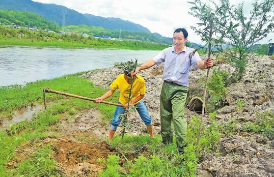 郭彩廷與鎮(zhèn)干部在猴橋鎮(zhèn)古永河邊義務(wù)植樹