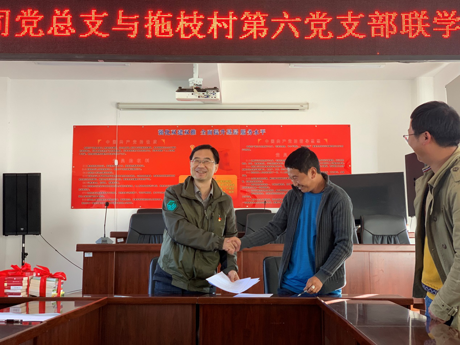 支部結(jié)對雙促進(jìn),共建共享強(qiáng)黨建。自公司黨組織成立以來,嚴(yán)格按照省財(cái)政廳機(jī)關(guān)黨委扶貧工作要求,農(nóng)擔(dān)公司黨(總)支部與永春鄉(xiāng)拖枝村第六黨支部開展了支部共建“雙一雙”學(xué)習(xí)教育、經(jīng)驗(yàn)交流,10月22日公司黨總支書記郭影與拖枝村第六簽訂了黨支部結(jié)對共建協(xié)議書,并捐贈黨建和農(nóng)業(yè)科技方面讀書,把黨建工作與精準(zhǔn)扶貧工作相結(jié)合,充分發(fā)揮農(nóng)擔(dān)公司黨組織全心支農(nóng)、為農(nóng)、惠農(nóng)、不脫農(nóng)的先鋒模范作用,以黨建推動脫貧攻堅(jiān),以脫貧攻堅(jiān)促進(jìn)支部黨建,促進(jìn)了扶貧工作與黨建工作的良性互動。