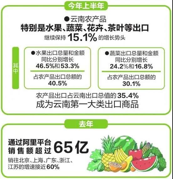 砥礪打造,一朝噴薄。今年上半年,在新冠肺炎疫情對全國進出口貿易帶來嚴重沖擊的大背景下,云南農產(chǎn)品特別是水果、蔬菜、花卉、茶葉等多個品種出口逆市增長,繼續(xù)保持15.1%的增長勢頭。其中,水果出口總量和金額同比分別增長46.5%和53.3%,占農產(chǎn)品出口總額的40.5%;蔬菜出口總量和金額同比分別增長24.2%和16.8%,占農產(chǎn)品出口總額的30.1%。1月至6月,農產(chǎn)品出口占云南出口總值的35.4%,成為云南第一大類出口商品。