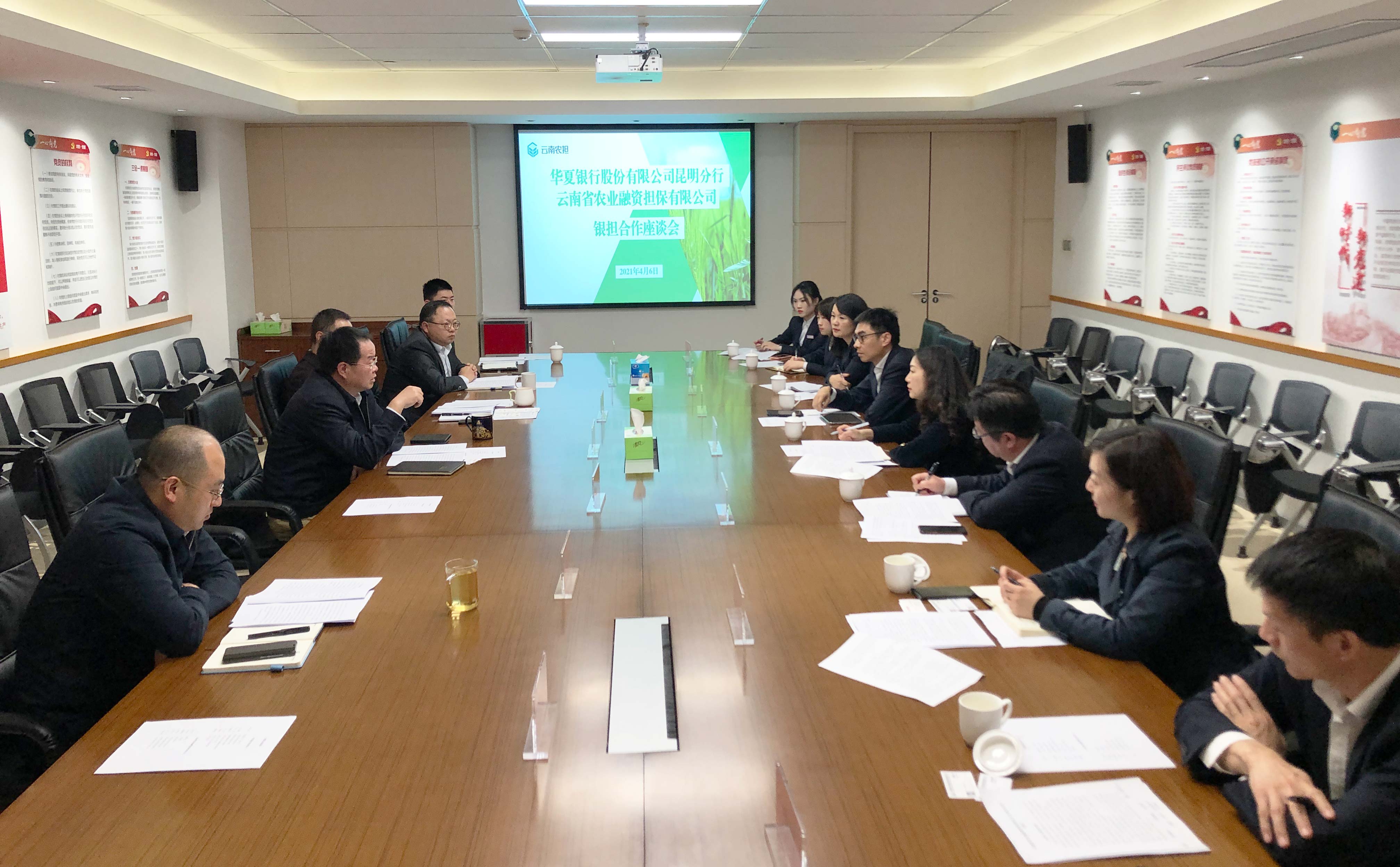 4月6日,云南農(nóng)擔(dān)與華夏銀行昆明分行召開銀擔(dān)合作座談會。華夏銀行季少青副行長攜授信審批部、普惠金融部、公司業(yè)務(wù)部、供應(yīng)鏈業(yè)務(wù)金融部和金江支行負責(zé)人等參加會議。農(nóng)擔(dān)公司董事長杜開波、總經(jīng)理李世偉、副總經(jīng)理廖寅皓,業(yè)務(wù)發(fā)展部、風(fēng)險控制部、戰(zhàn)略發(fā)展部和昆明專營中心負責(zé)人參會。