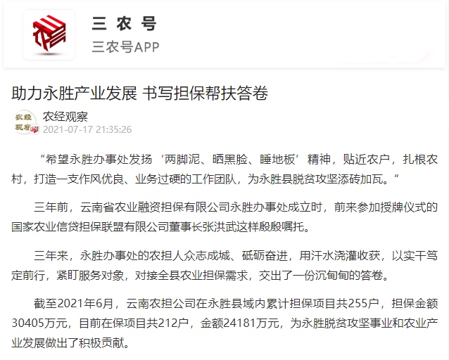 云南農(nóng)擔(dān)永勝辦事處自2019年8月22日成立,充分彰顯了云南農(nóng)擔(dān)服務(wù)網(wǎng)絡(luò)擴(kuò)面下沉的深度和力度,也體現(xiàn)了國家農(nóng)擔(dān)對云南省鄉(xiāng)村振興戰(zhàn)略實施的大力支持。2021年7月17日,《農(nóng)民日報》三農(nóng)號以“助力永勝產(chǎn)業(yè)發(fā)展 書寫擔(dān)保幫扶答卷”為題對云南農(nóng)擔(dān)永勝辦事處進(jìn)行了專題報道。以下是詳細(xì)內(nèi)容: