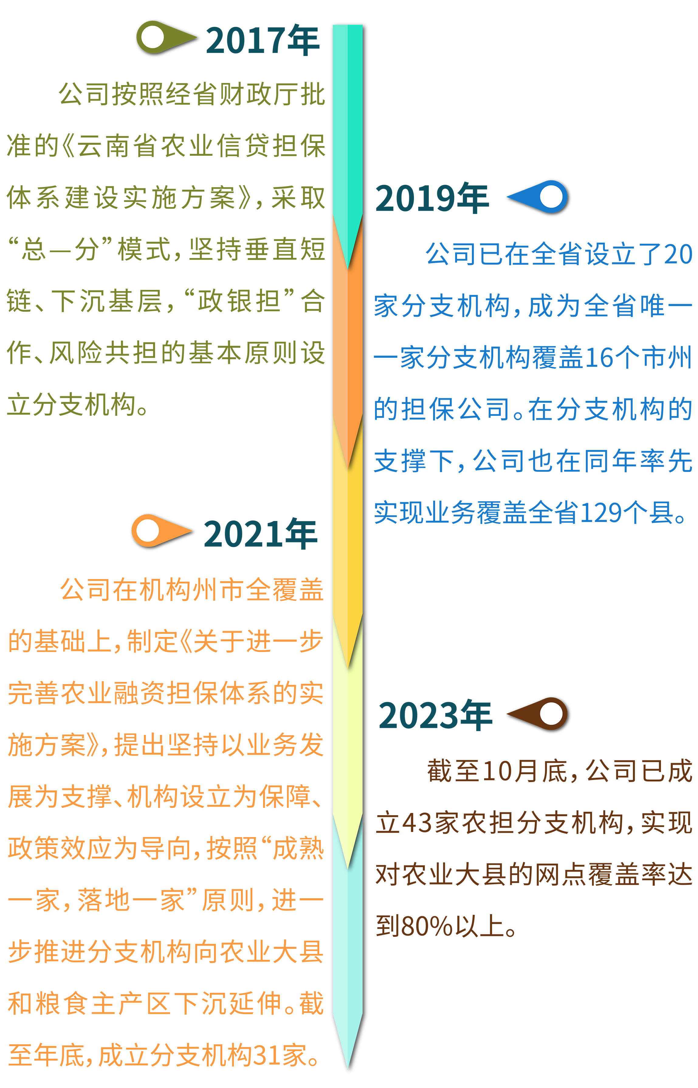 近日,隨著公司彝良辦事處、云縣辦事處先后掛牌,全省共計43家農擔分支機構投入運營,我省農業(yè)信貸擔保體系建設規(guī)劃全面完成,農業(yè)信貸擔?;A進一步夯實,支農助農手段顯著增強。