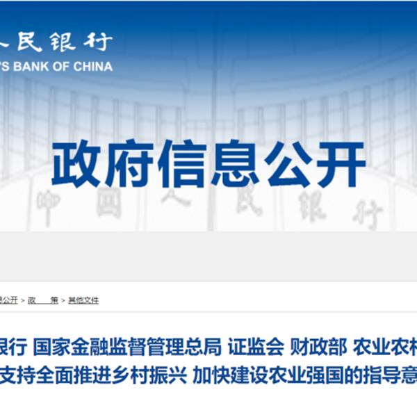 中國人民銀行、金融監(jiān)管總局、中國證監(jiān)會、財(cái)政部、農(nóng)業(yè)農(nóng)村部近日聯(lián)合發(fā)布《關(guān)于金融支持全面推進(jìn)鄉(xiāng)村振興 加快建設(shè)農(nóng)業(yè)強(qiáng)國的指導(dǎo)意見》。